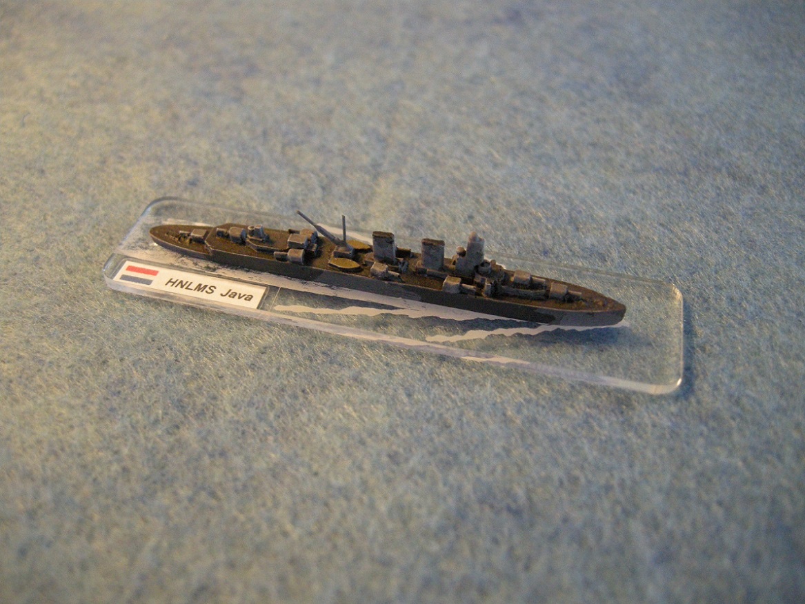 A placeholder for the fleet cabinet, a 1/2400 Panzerschiffe model of HNLMS Java, as she would have appeared at her 1942 demise.